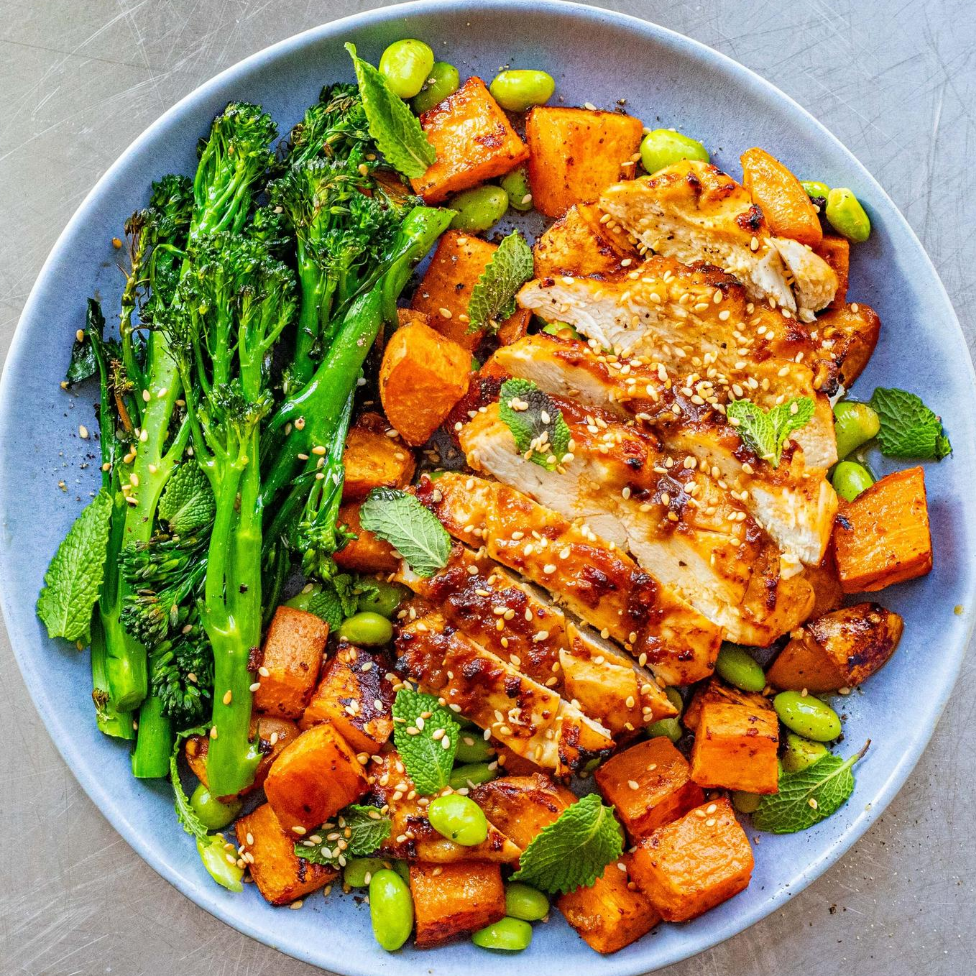 knoflook, sojasaus, honing, chili olie, sojabonen, sesamzaad, kippendij, zoete aardappel, bimi, edamame, munt, zonnebloemolie, zoet, peper.