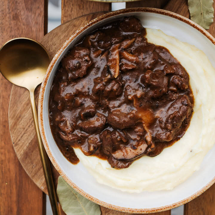 Met gekarameliseerde ui en aardappelpuree.